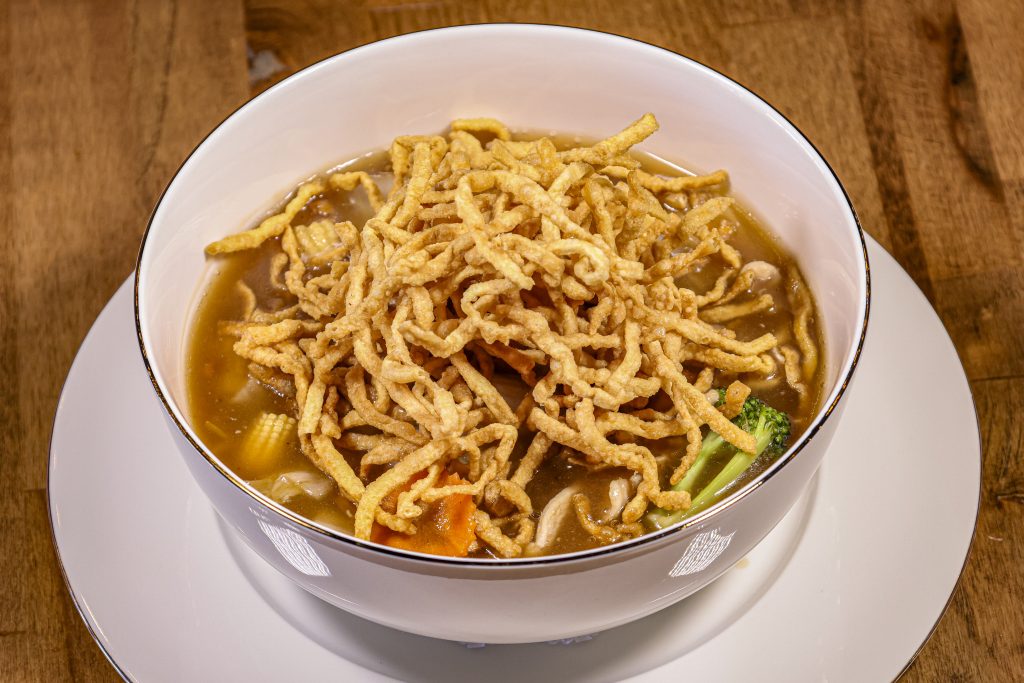 Crispy egg noodles cooked with mushrooms, broccoli and carrots topped with gravy sauce.