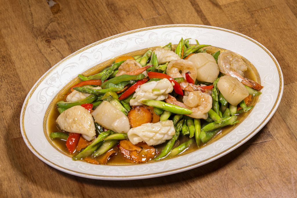 Sauteed, fresh asparagus nixed with shrimp, scallops, calamari, and carrots in a homemade chili and garlic sauce.