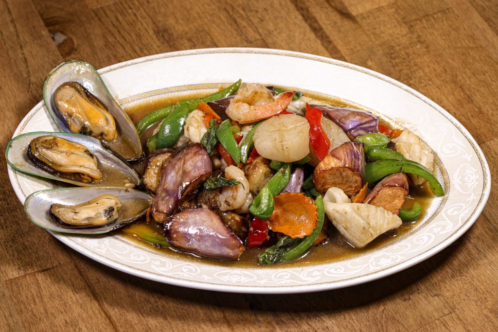 Shrimp, squid, scallops, and mussels stir-fried in a homemade spicy sauce with green beans, onions, bell peppers, and basil leaves.