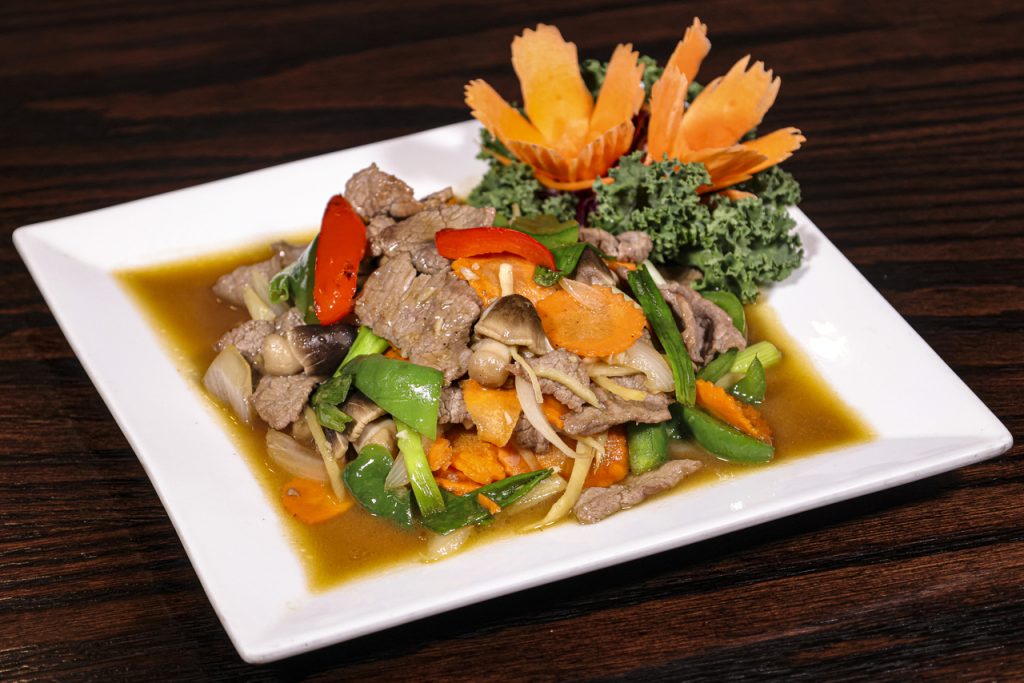 Grilled salmon topped with a spicy basil sauce stir-fried with bell peppers, green bean, carrots, onions and basil leaves.