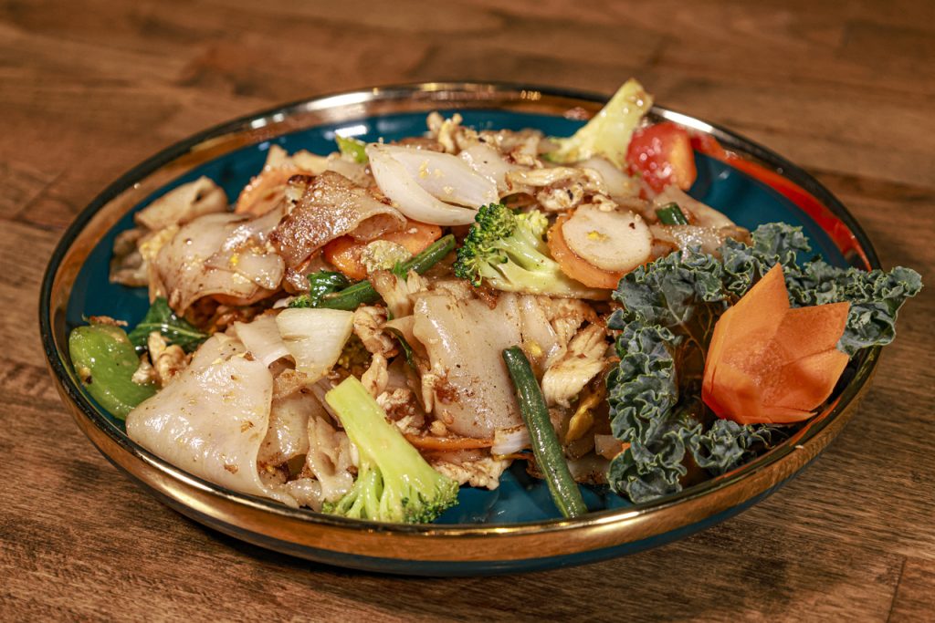Thin flat Rice noodles stir-fried with cabbage, broccoli, carrots, and egg in a homemade sauce.