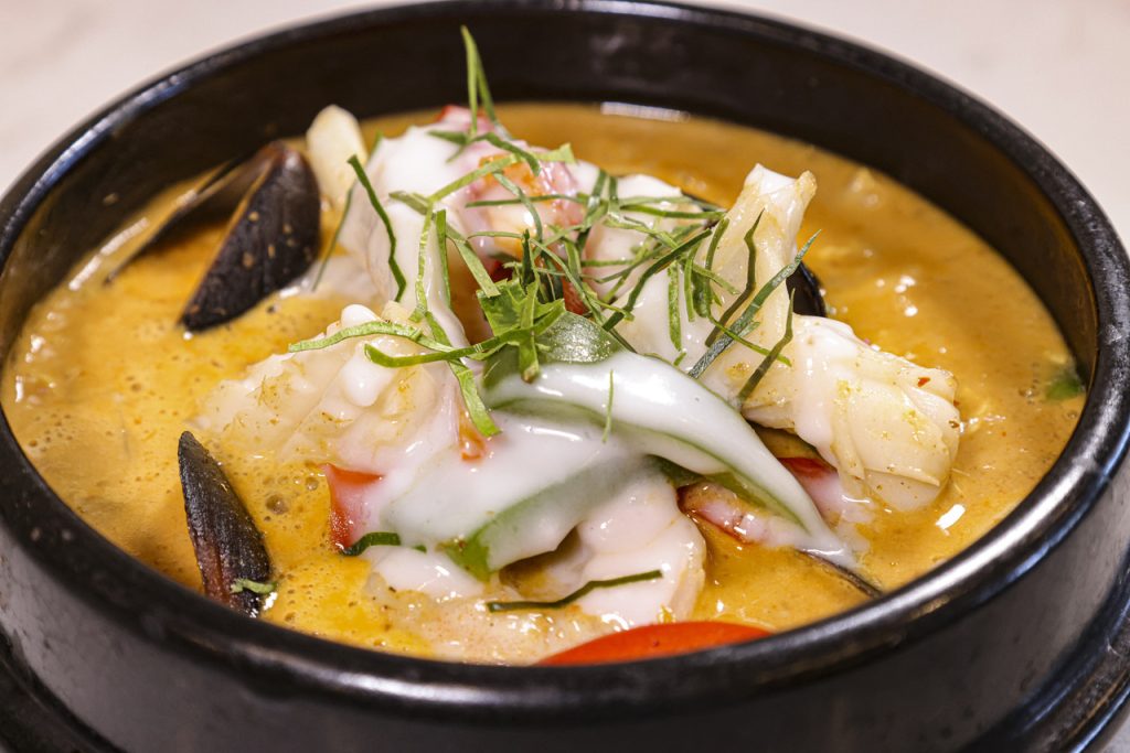 Shrimp, mussels, scallops, and squid cooked in a Panang curry sauce in a bed of mixed vegetables, served on a hot pot.
