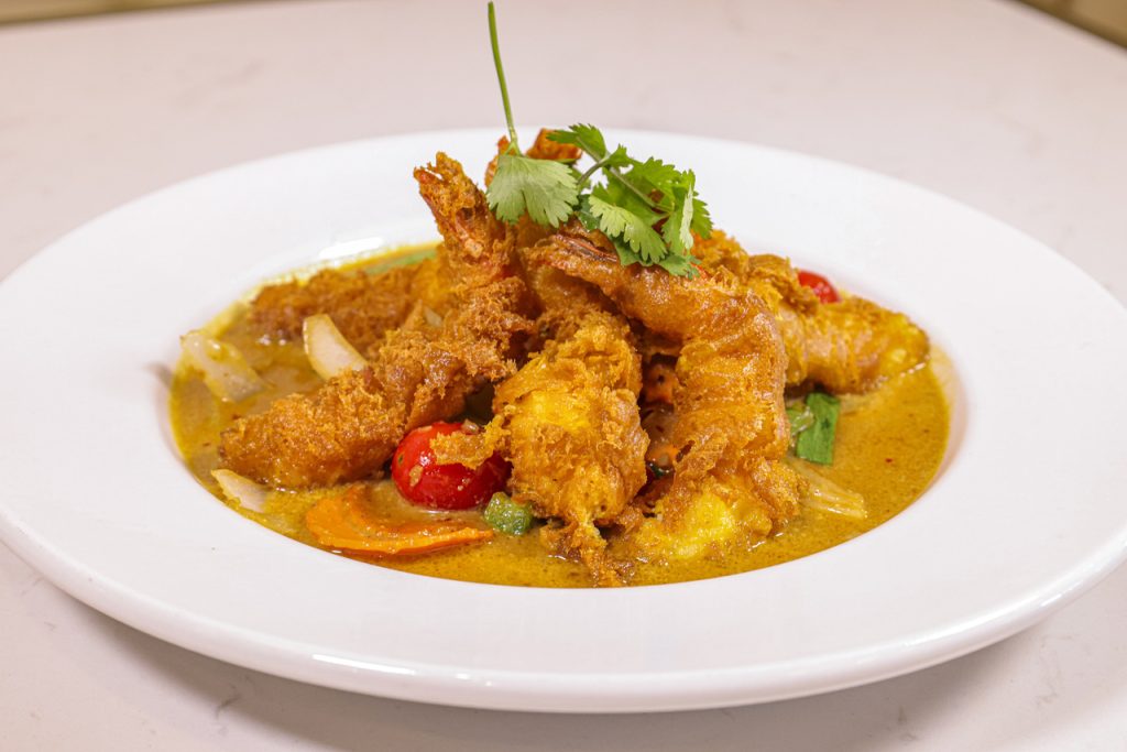 Jumbo shrimp cooked in choo chee sauce in a bed of mixed vegetables.