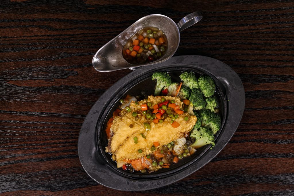 Fried tilapia filet in Sam Ros 3 flavored sauce (sweet, sour and chili) served with mixed vegetables.