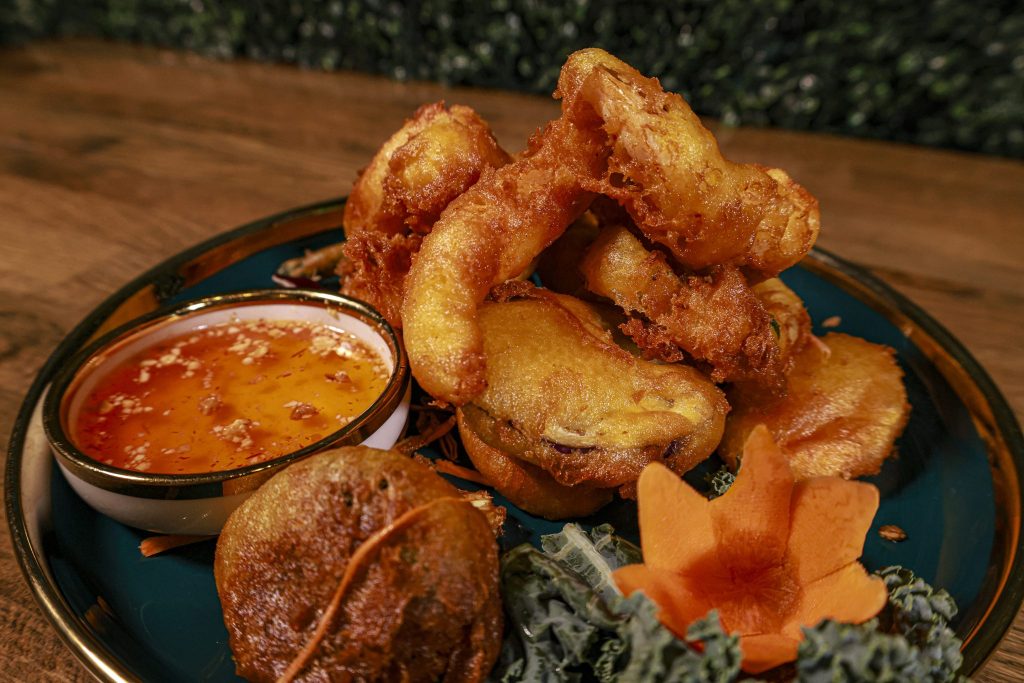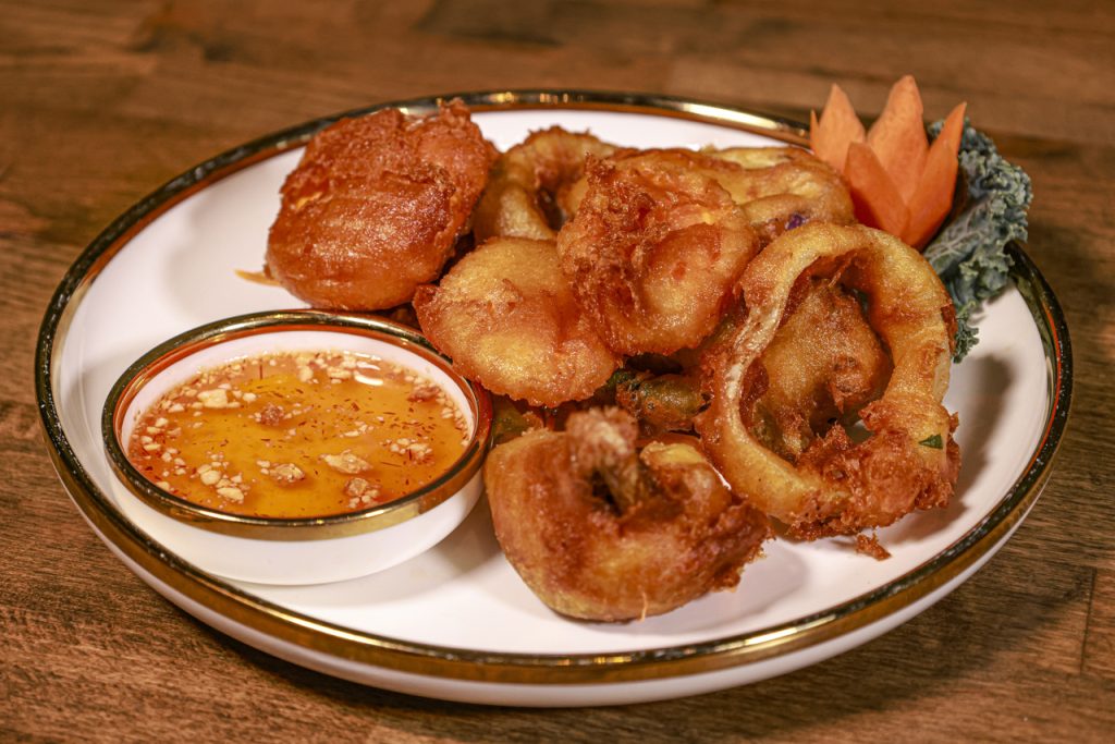 Our special combination appetizer: chicken satay, Thai spring roll, crispy wonton, shrimp blankets, golden tofu calamari and shrimp tempura, crab rangoon, vegetables tempura and Thai fish cakes.