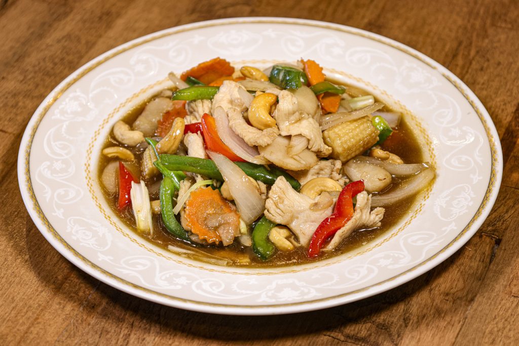 Meat stir-fried with cashew nuts, carrots, mushrooms, water chestnuts, and onions.