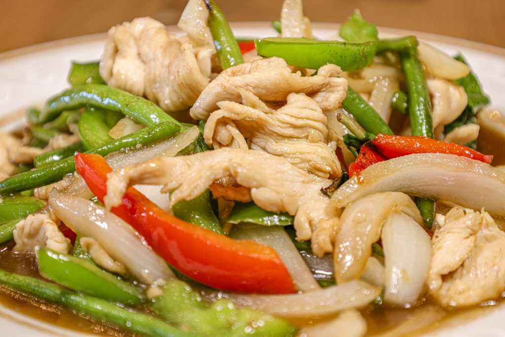 Meat stir-fried in a homemade, spicy sauce with green beans, onions, bell peppers, basil.
